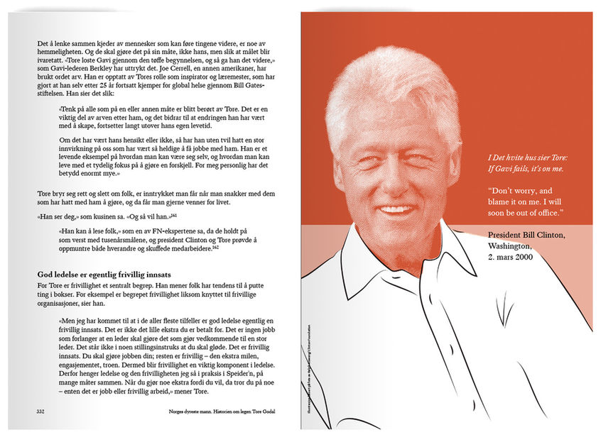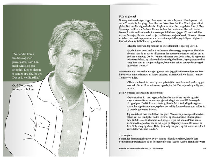 Norway’s Most Expensive Man – The Story of Dr. Tore Godal. Cover — inspiration and form: Dr. Tore Godal rides through the composition in a grey anorak, a man who commands the space without ever demanding it. The illustration draws its sense of movement from a small collage in the book 'Hergé' (Éditions Moulinsart, 2006. © Hergé-Tintinimaginatio 2026). The reference is a gentle spark only; the artwork itself is entirely original, shaped from the ground up in its own living line. It reflects what defines him: the unadorned, the understated — the man who arrives by bicycle while others pull up in limousines. Eight portraits were created from photographs, each carrying the same relaxed energy: informal moments, no ties, no suits. Colour and gesture highlight the strength, calm, and presence of the people behind the stories. Client: KnowHow Media, published by Historie & Kultur.